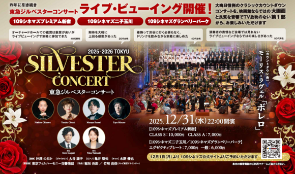 テレビ東京が主催する大晦日の大人気公演「東急ジルベスターコンサート」。昨年に引き続きライブビューイングを、109シネマズで開催いたします!大晦日の風物詩としておなじみになりました本公演は、皆様のおかげで31回目を迎えます。