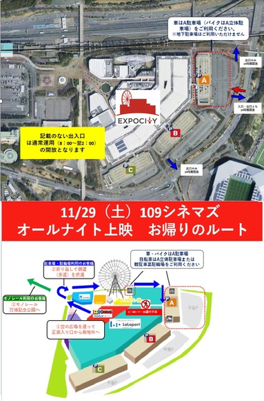 109シネマズ大阪エキスポシティ20周年記念オールナイトへお車(バイク・自転車)でお越しのお客様へのご案内です。当日、24時間開放されております駐車場は【PA】駐車場のみとなります。