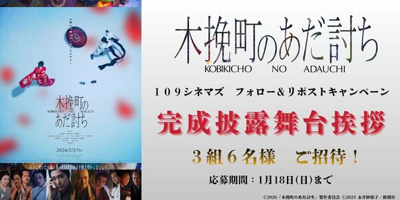 109シネマズ公式Xアカウントをフォローしてキャンペーン投稿をリポストすると、抽選で『木挽町のあだ討ち』完成披露舞台挨拶にご招待いたします!【キャンペーン概要】