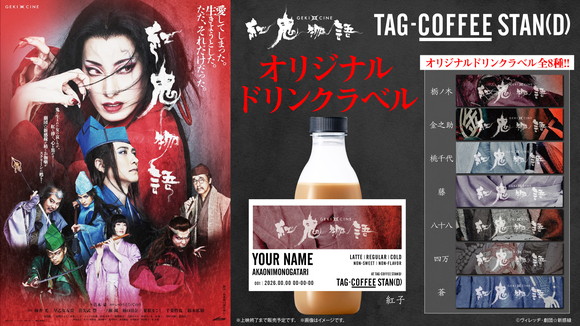 オリジナルラベルドリンクが作れるサービス「TAG-COFFEE STAN(D)」から、ゲキ×シネ「紅鬼物語」オリジナルラベルが登場!ゲキ×シネ『紅鬼物語』メインキャストの華麗な衣裳がデザインされているラベルをこの機会に是非、劇場にてお求めください!
