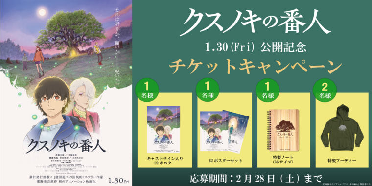 本作、映画『クスノキの番人』を109シネマズでご鑑賞いただき、半券/QRコードのスクリーンショットを応募フォームにご登録いただくと、映画『クスノキの番人』チケットキャンペーンに参加いただけます。