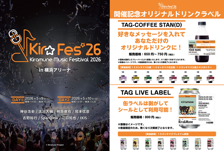 ドリンクとラベルを自分らしくカスタマイズできるサービス「TAG-COFFEE STAN(D)」と「TAG LIVE LABEL」から、『Kiramune Music Festival 2026』の開催を記念して、109シネマズオリジナルラベルが2026年4月3日(金)より販売決定!