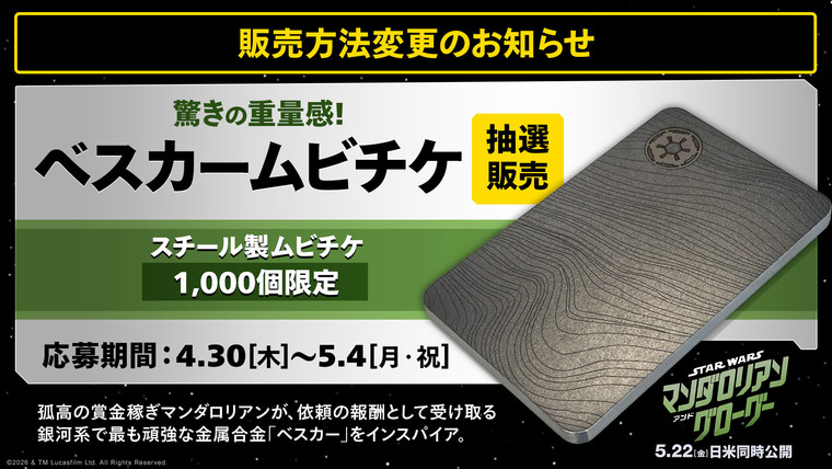 5月4日(月・祝)の「スター・ウォーズの日」から販売予定の「ベスカーにインスパイアされた、スチール製のムビチケ」につきまして、当初は映画館での先着順による販売を予定しておりましたが、販売方法を変更させていただくこととなりました。
